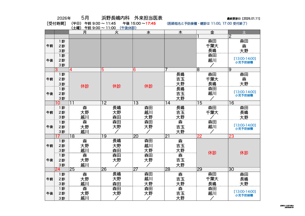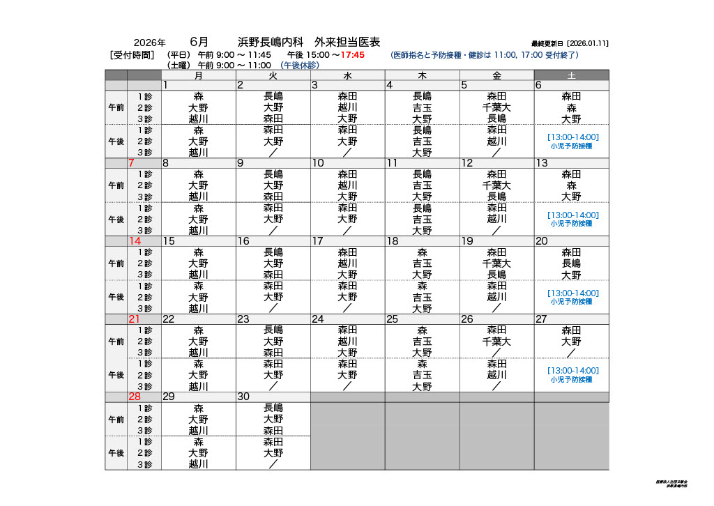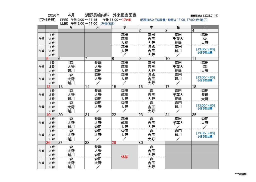 | 午後 15:00-17:45 | ◯ | ◯ | ◯ | ◯ | ◯ | 小児予防接種 (13:00~14:00) |